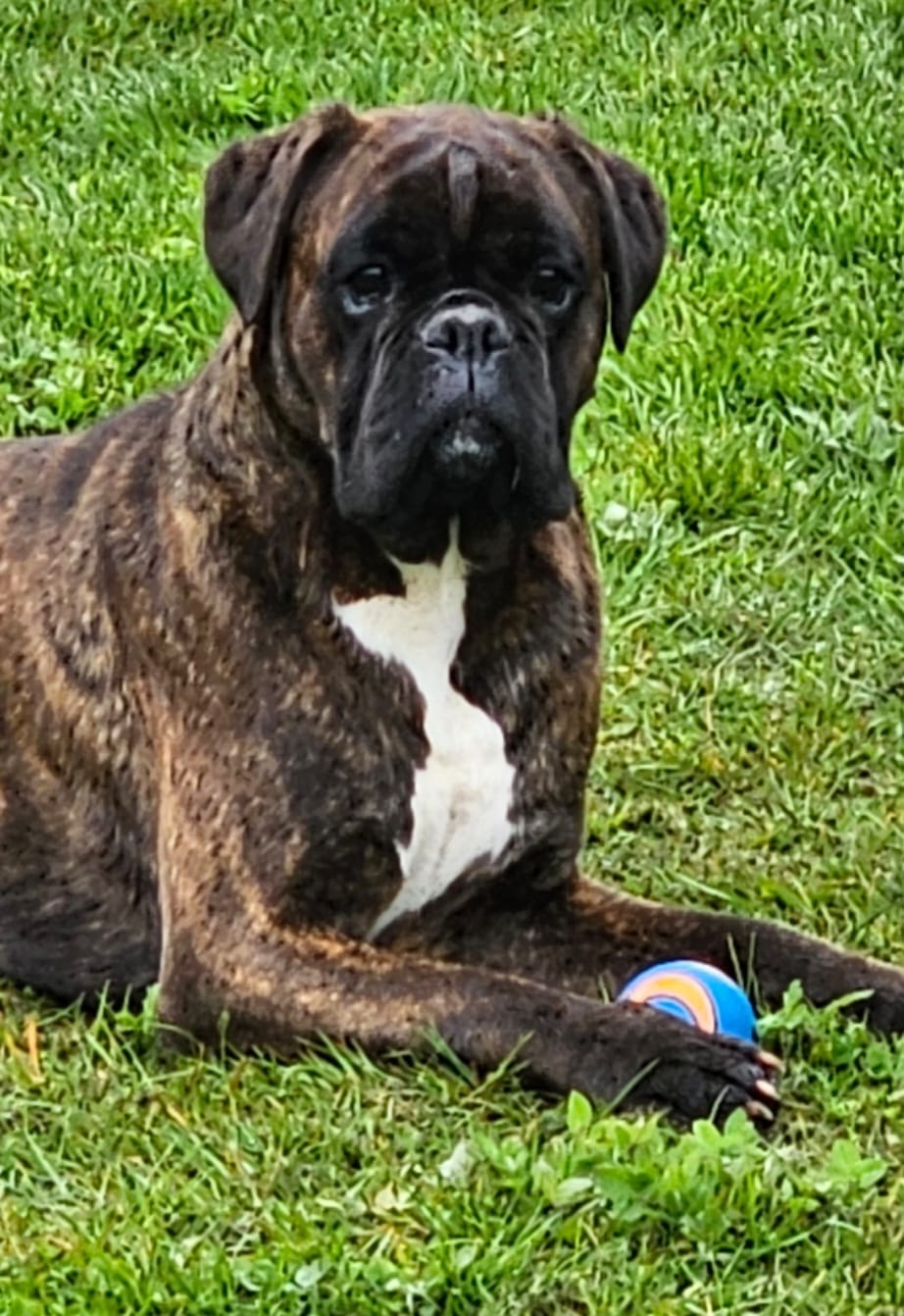 Ivy is our biggest clown of the family. She has a little bit of play drive given to her by her wonderful sire Black Knight with her mothers silliness. This girl loves to lay in bed all day long and would rather sleep in then get up early. When it comes time to play however she is all about it! This is the best of both worlds. Her name to fame is when she gets excited she goes “bucking crazy” as she jumps up and down rearing and bucking as she wiggles and snuffles. One of our favorite boxers from our late Iris who we hold a special place in our heart.