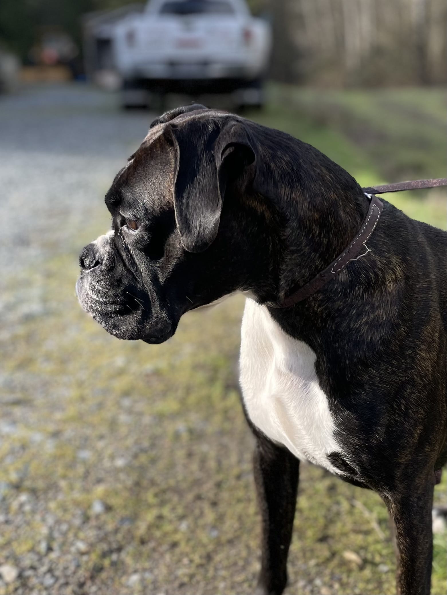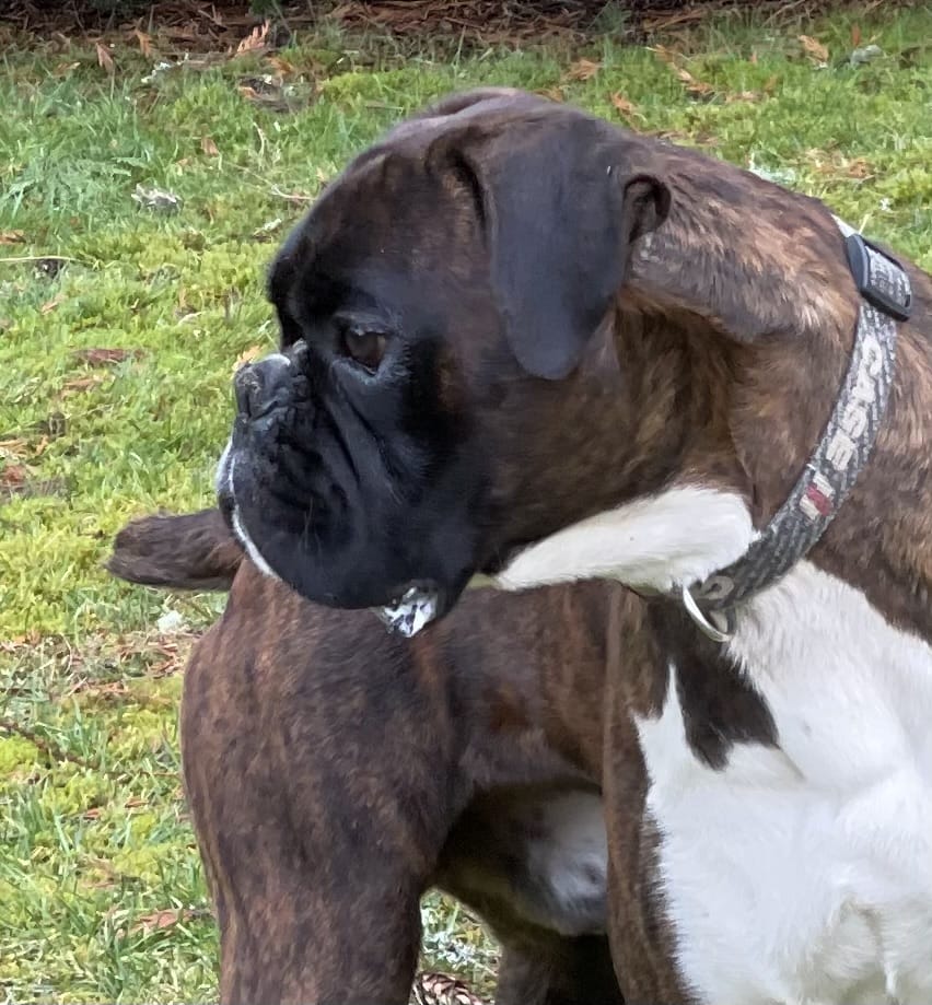 Tuxedo has retired and is now living with a family in Oregon, however we have kept one of his daughters to carry on the line. He is an amazingly fun-loving guy that has tons of toy drive and loves his people. He will play with almost any dog he comes across, even intact males unless they are trying to steal his ball! Lol. He absolutely loves water, and will take a dip even in the dead of winter! I swear he is part Labrador! We purchased Tux from a breeder friend of ours November 2021! He fit right in with the pack and got along with both our boxers and our shepherds. He adores children especially if they will throw a ball for him! Tux has produced large males (70-95lbs) and average to large females (55-70lbs) depending on the size and bloodline of the bitch. The best part is that he produced consistency in conformation throughout each litter.
